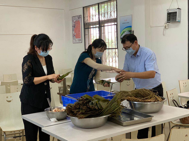 活動現(xiàn)場準(zhǔn)備了糯米、粽葉、板栗、蛋黃等材料,大家圍在一起,從嘗試、普及到大展身手,歡聲笑語、棕葉飄香,參與人員包得不亦樂乎。